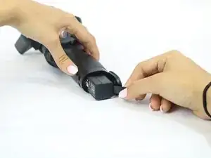 Вытащите аккумулятор, нажав на красную кнопку. Аккумулятор освободится и его можно вытащить, используя прикрепленную черную ленту.