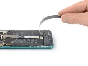 Сложите дисплей и связующий гибкий кабель в сторону разъёма зарядки, чтобы получить свободный доступ к обеим вытяжным лентам батареи и к самой батарее.