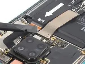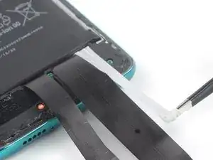 Осторожно отогните кабель питания и кнопок громкости в сторону с помощью лопатки, чтобы освободить аккумулятор.