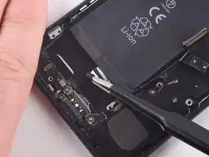 Используйте пинцет с тупыми наконечниками, чтобы отогнуть другую клейкую ленту на нижнем крае аккумулятора.