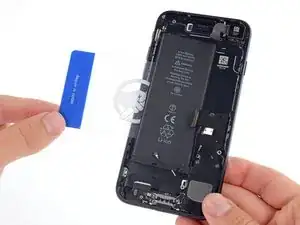 Примерно через минуту снимите iOpener, переверните телефон и используйте пластиковую карту, чтобы разрушить оставшийся клей за аккумулятором.
