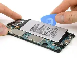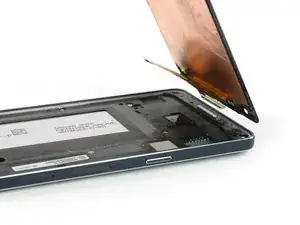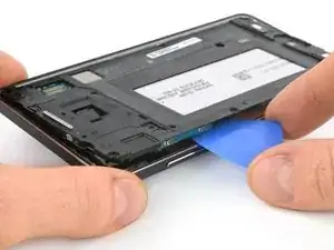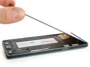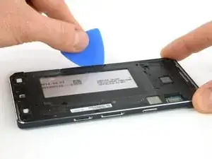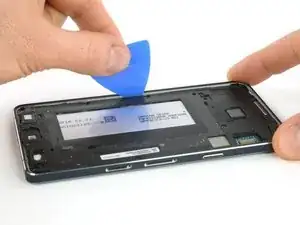 С помощью монтажной лопатки можно попасть между средней рамкой и аккумулятором, чтобы отделить его от клея.