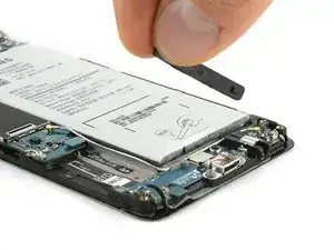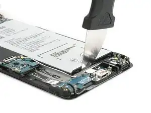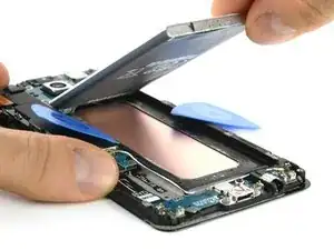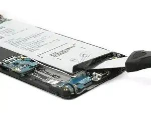 Между аккумулятором и средней рамкой находится пластиковая распорка, для удаления которой потребуется металлический рычажный инструмент. Будьте крайне осторожны, чтобы не проколоть аккумулятор.