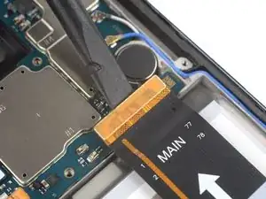 Отогните гибкий шлейф соединительного кабеля в сторону разъёма зарядки, чтобы получить свободный доступ к аккумулятору.