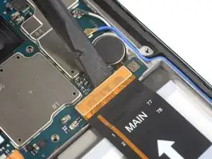 Используйте плоский конец лопатки, чтобы поддеть и отключить шлейф соединительного кабеля от его разъёма.