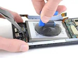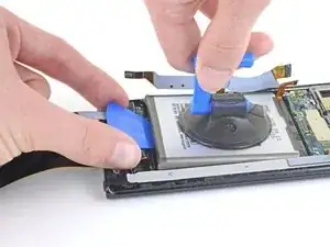 Просуньте медиатор под аккумулятор, чтобы прорезать клей и отделить аккумулятор от рамки.