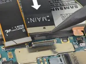Используйте заострённый конец монтажной лопатки, чтобы поддеть и отсоединить белый пресс-коннектор, расположенный в правом нижнем углу экрана платы.