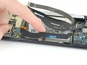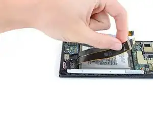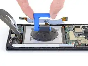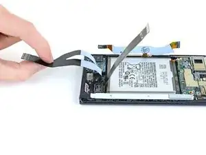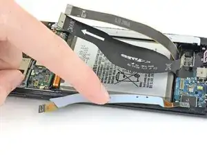 Вторичный соединительный кабель всё ещё прикреплён к телефону лентовым кабелем. Нужно лишь отодвинуть кабель настолько, чтобы получить доступ к аккумулятору.