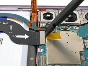 Используйте острый конец лопатки, чтобы приподнять и отключить пресс‑разъём катушки беспроводной зарядки от материнской платы.