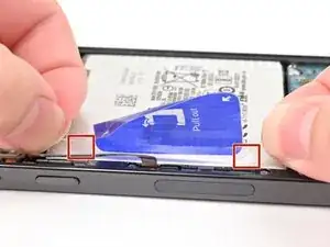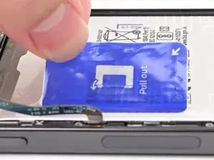 Отошлите клейкую ленту‑язычок аккумулятора в сторону левого края телефона.