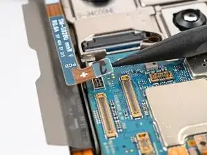 Используйте лопатку, чтобы поддеть и отключить пресс‑коннектор катушки беспроводной зарядки пресс‑коннектора от материнской платы.