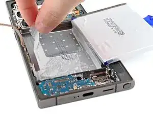 Батарея удерживается лентой двустороннего клеевого слоя, которая сложена под батареей. При подъёме батареи за язычок с левой стороны край поднимется, а правый край — нет. Оставшуюся плёнку и батарею Вы удалите в следующем шаге.