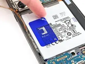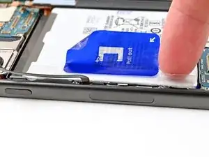 Одной рукой прочно удерживая рамку телефона, приложите ровную, уверенную силу и потяните синий язычок строго вверх, пока батарея не отделится от нижнего слоя клеевой плёнки.