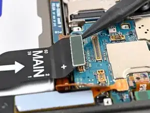 Используйте лопатку, чтобы аккуратно поддеть угол язычка катушки беспроводной зарядки, приклеенного к правому краю рамы.