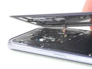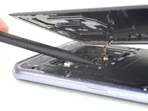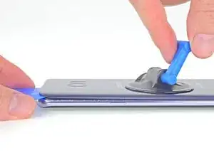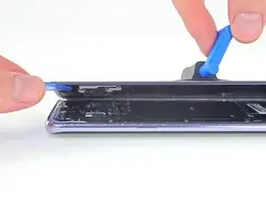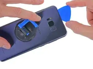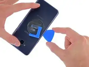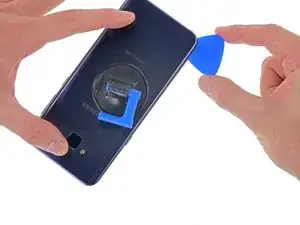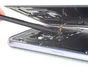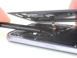 Вы можете повредить гибкий кабель датчика отпечатков, если вставите медиатор слишком глубоко на этом этапе. Работайте аккуратно и ориентируйтесь по схеме в шаге 2.