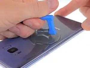 Поднимите левый край задней крышки с помощью присоски, чтобы образовалась небольшая щель между крышкой и рамкой.
