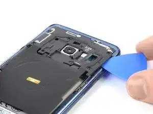Вставьте медиатор под правую сторону пластиковой крышки, содержащей антенну NFC и индукционную катушку зарядки.