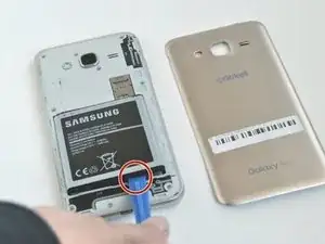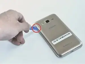Снимите заднюю крышку телефона, используя инструмент для открытия или ноготь, подденьте выступ в верхнем левом углу.