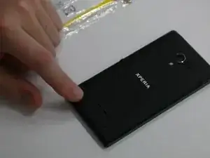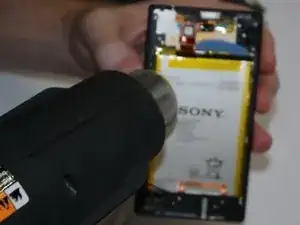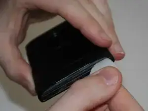 Пока телефон ещё тёплый/горячий (и не обожгите руки), вставьте медиатор/инструмент для вскрытия под батарею сверху. потребуется некоторое усилие