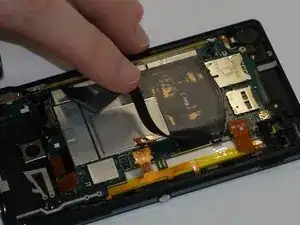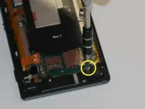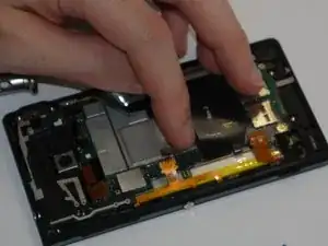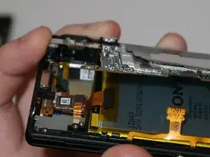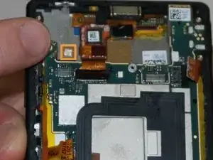 Теперь мы можем снять материнскую плату. Начните, поддев с левой стороны телефона, убедившись, что ни один из ленточных кабелей не зацепляется за плату при её подъёме