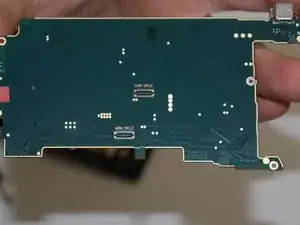 Снимите металлический кронштейн, поддев с стороны печатной платы (как показано). Он приклеен к порту зарядки; не удивляйтесь, если потребуется дополнительное усилие