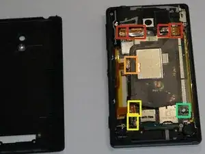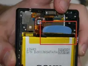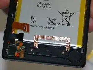 Посмотрите на фото 2 и 3 — отогните антенну NFC (тонкая чёрная деталь) вверх, чтобы открыть медную ленту, соединяющую разъём и металлическую часть платы. Отклейте её от разъёма.
