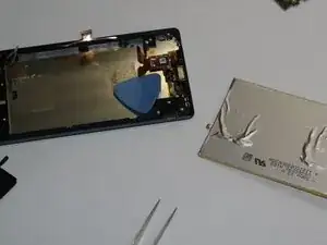 Мы будем снимать компоненты с задней части телефона; аккумулятор зажат между платой и экраном, поэтому он находится прямо посередине всех компонентов