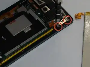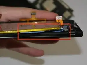 Левый верхний гибкий кабель является причиной дополнительной сложности при полном разделении двух частей. Но поскольку клей относительно небольшой (см. 2-е фото), аккуратно отрывая разъём под углом 90 градусов от телефона медленным и равномерным движением, он должен отсоединиться без повреждения какого-либо кабеля