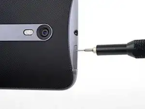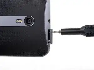 Сожмите пару заостренных пинцетов и вставьте их в маленькое отверстие на краю задней крышки рядом с гнездом для SIM-карты.