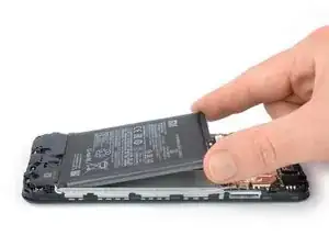 Возьмите первый язычок пинцетом с притуплёнными концами или пальцами и медленно потяните его от батареи в направлении верхнего края телефона.