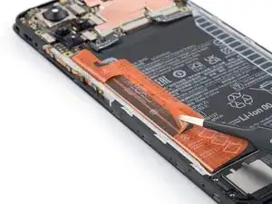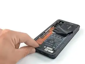 Используйте пинцет с тупыми концами или чистый ноготь, чтобы отклеить оранжевую ленту с маркировкой A от аккумулятора.