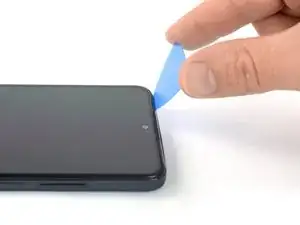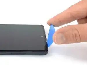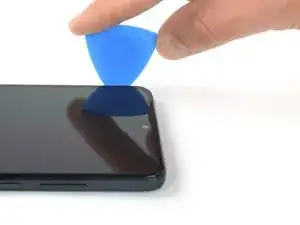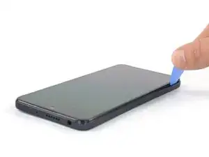 Проведите разделительным инструментом вдоль нижнего левого угла устройства, чтобы отсоединить пластиковые защёлки.