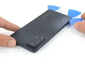 На данном этапе задняя панель должна быть полностью отделена от корпуса. Если вдоль краёв ещё сохраняется сопротивление, используйте разделительный инструмент для удаления остатка клея.