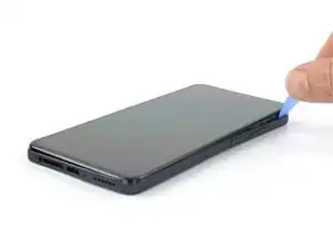 Вставьте разделительный инструмент между средней рамой и передней панелью в нижнем левом углу устройства, где расположен лоток для карты SIM.