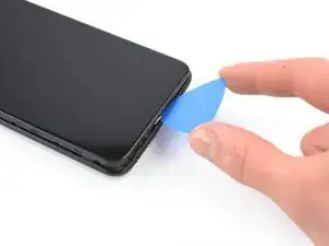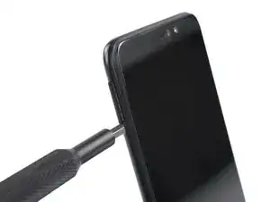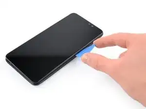 Вставьте медиатор для вскрытия между экраном и задней крышкой на левой кромке телефона, где находился лоток SIM‑карты.
