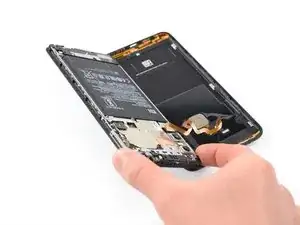 Аккуратно отогните сборку телефона в левую сторону от задней крышки, как будто открываете книгу.