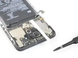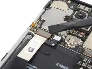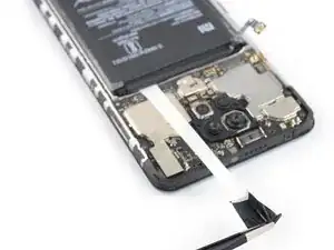 Пока не пытайтесь полностью отделить сборку телефона от задней панели — гибкий кабель сканера отпечатков пальцев всё ещё подключён к материнской плате.