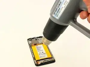Используйте тепловой пистолет, чтобы разогреть клей под аккумулятором.