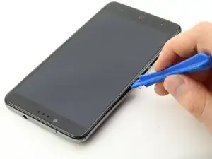 Подденьте пластиковым инструментом для вскрытия между экраном и задней панелью.