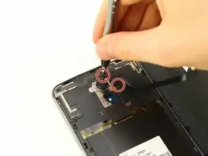 Отверткой Phillips #00 выверните два винта 3,0 мм, расположенные в верхней части телефона рядом с тыльной камерой.