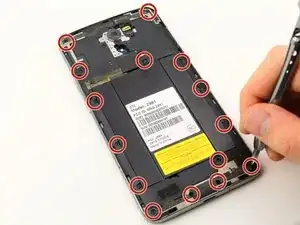 Отверткой Phillips #00 выверните 15 винтов 3,0 мм задней панели, расположенных по периметру телефона.