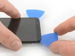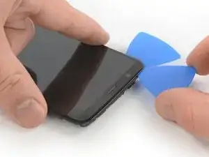 Вставьте второй захват‑пик и сдвиньте его к нижнему левому углу телефона, чтобы перерезать клей.