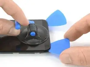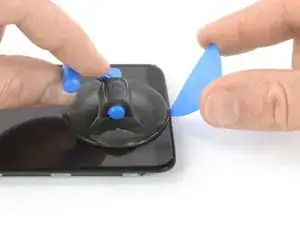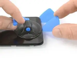 Потяните присоску вверх и вставьте захват‑пик в зазор между стеклом дисплея и серединной рамой. Начните резать клей, сдвигая захват‑пик к нижнему правому углу.