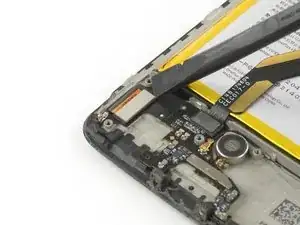 Используйте лопатку, чтобы приподнять и отсоединить шлейф зарядного порта и аудиоразъёма.