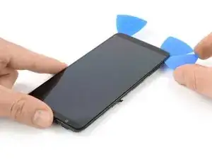 Сдвиньте захват‑пик вдоль верхнего края телефона, чтобы перерезать клей. Оставьте пик в верхнем правом углу экрана, чтобы клей не застыл снова.