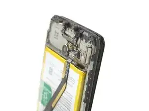 Используйте пинцет, чтобы снять маленькую металлическую пластину, закрывающую разъёмы шлейфов батареи, зарядного порта и аудиоразъёма.