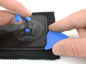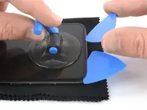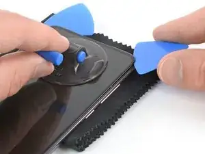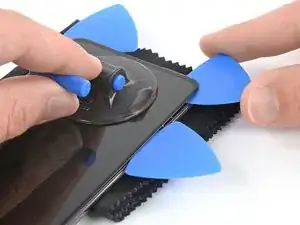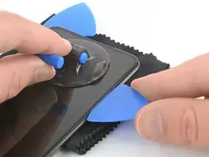 Используйте присоску, чтобы приподнять экран, и вставьте только кончик медиатора под правый край выреза динамика.
