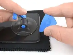 Осторожно относитесь к тыльным камерам и вставляйте только кончик медиатора. По мере остывания клей затвердевает и его труднее резать. При необходимости снова используйте iOpener для повторного нагрева.