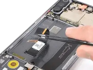 Используйте пинцет, чтобы отлепить шлейф дисплея от центральной рамки. Он приклеен слабо.
