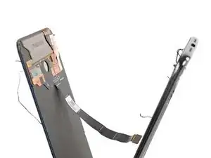 Медленно отделяйте экран от рамки и разрезайте остатки клея. Убедитесь, что шлейф больше не приклеен к рамке, и аккуратно протяните его через имеющийся зазор.